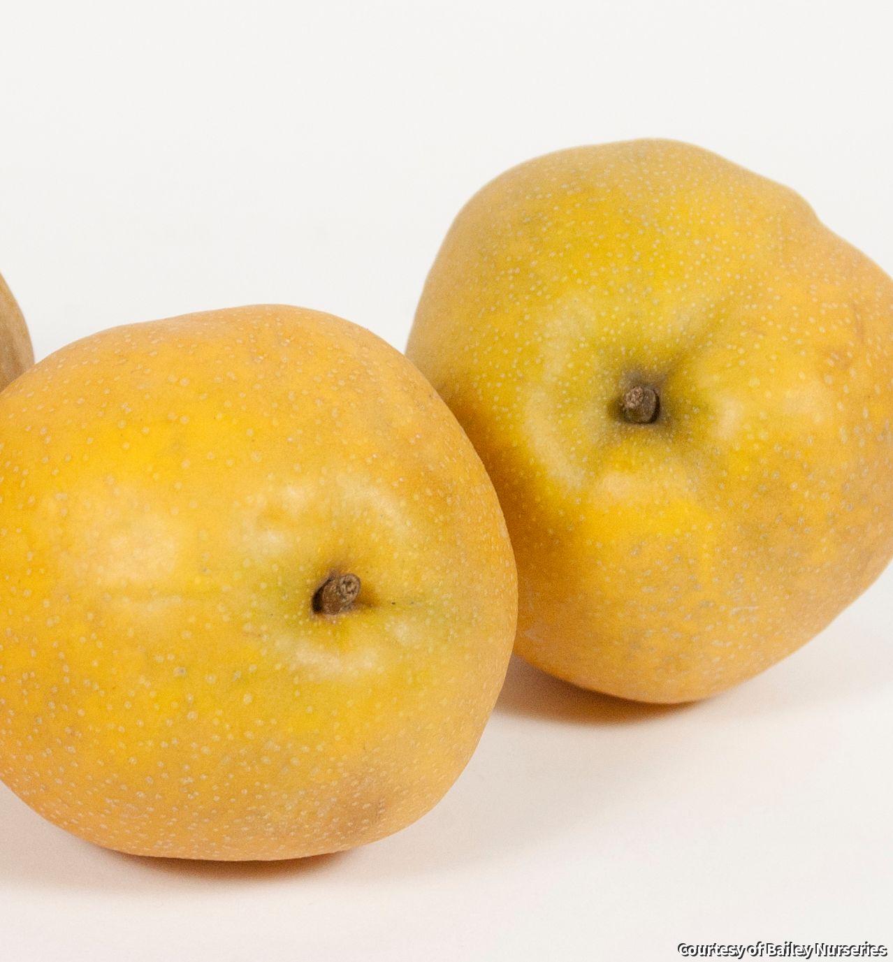 Attractive fruit-producing pear with prolific white spring blooms. The crispy, round fruits ripen to tan and have a taste between a pear and an apple. Self-pollinating