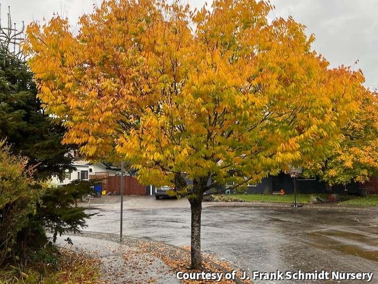 A compact, semi-dwarf tree with an oval to vase shape. The finely textured foliage takes on beautiful golden colors in the fall. It is an excellent choice for small yards, confined spaces and for use as a street tree.