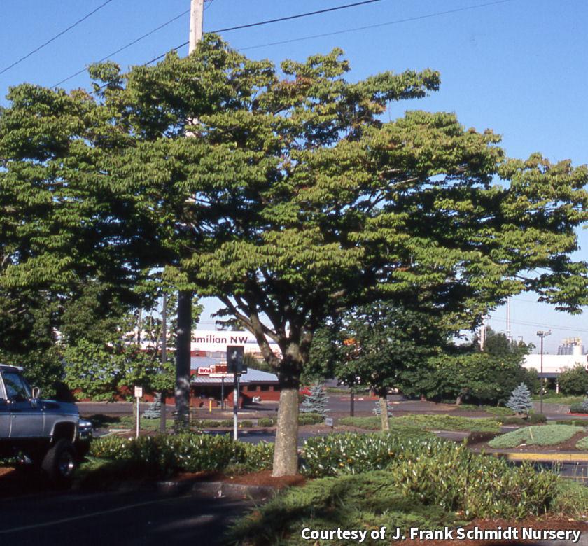 A broadly spreading vase shape makes this an ideal street tree and it fits into other spaces where height is a factor. As a bonus, its foliage turns beautiful red shades in fall. This is a tough, drought tolerant tree that is well-suited for urban sites.