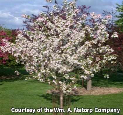 A compact spring blooming tree with deep pink buds that open to pinkish-white flowers followed by cherry-red fruit. The dark green summer foliage matures to deep wine red in late fall. It is a very showy tree for use as an accent in sunny sites.