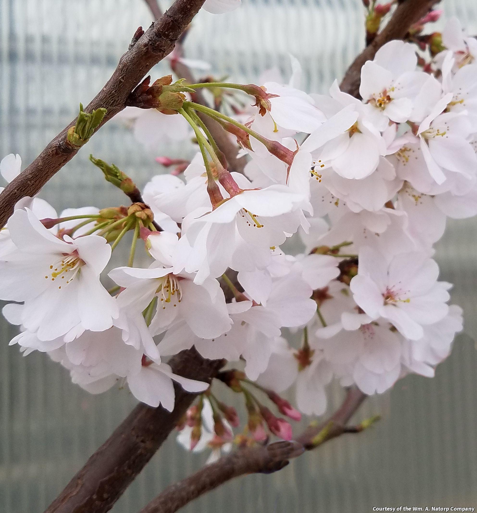 A graceful, ornamental cherry with prolific spring flowers. White flowers that are sometimes tinged with pink and are followed by ornamental black cherries. It is a popular tree in Washington, D.C. and puts on a spring show like no other.