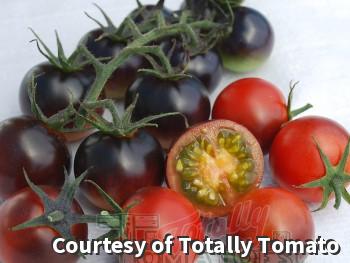 An unusual blue, 1 to 1 1/2" cherry tomato with attractive red flesh. Fruits grow in clusters, are mature when they are red with dark purple blushing, have a nice sweet & tangy flavor. These fruits are rich in anthocyanins, similar to blueberries.