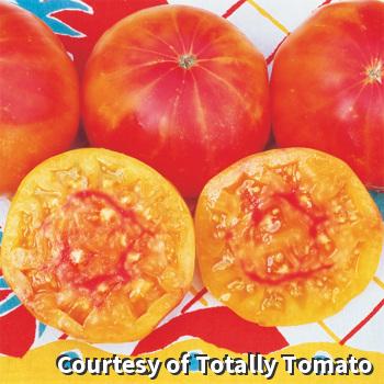 Beefsteak-type, golden orange fruits that will sometimes have stripes and swirls of color on the inside. Meaty tomatoes that are sweet and juicy with a fruity aftertaste. Up to 1-1/2 pounds each.