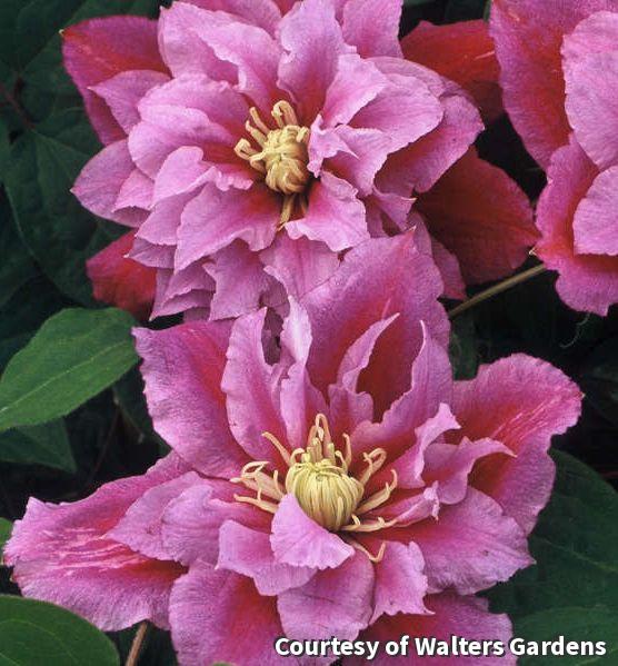 A heavy blooming variety that also reblooms for color throughout the summer. Blooms are rose with light pink edges. The first set of blooms are double or semi-double followed by single flowers blooming into late summer. Pruning group 2.