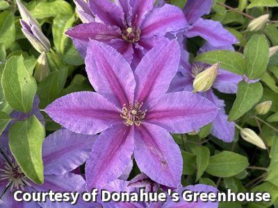 Beautiful large violet flowers with a complimentary dark pink bar. The center of the flower holding deep red tipped anthers. The first flush of 4-5" flowers appear in early May and June. A second, smaller flush will be produced in Sept. Pruning group 2.