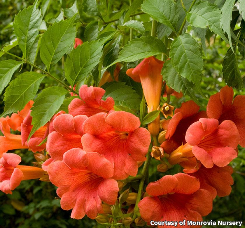 A vigorous climbing, native vine with tubular orange-red flowers during the summer. It is very easy to grow in most any location, but flowers best in full sun. It is an excellent choice for quickly covering fences and arbors.