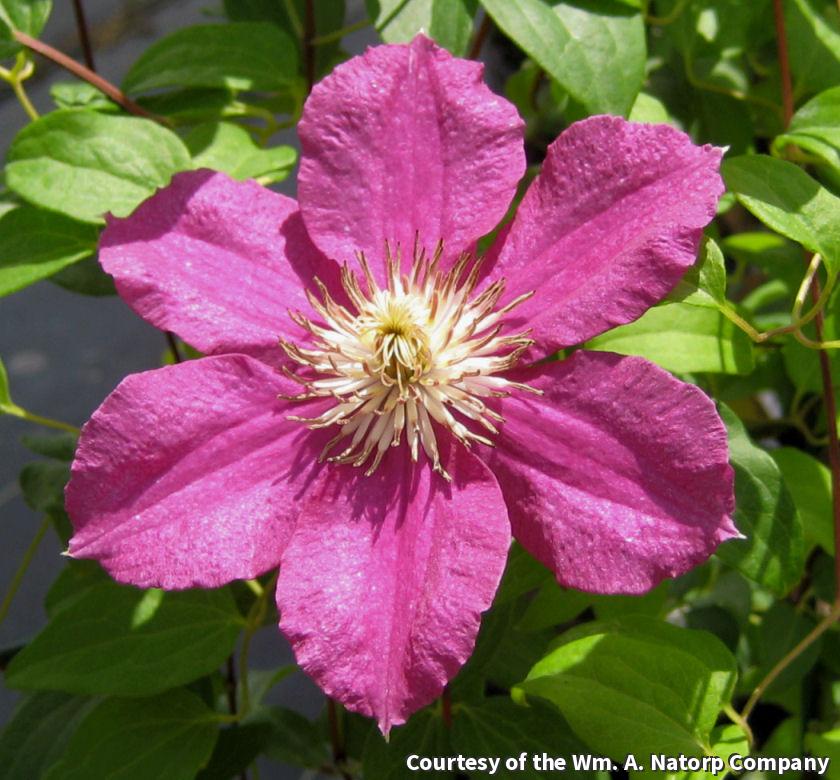 A popular, reliable variety of clematis with red-violet (magenta) flowers in mid-spring. It grows best in evenly moist soils where roots are cool. Grows well with trellises, fences and posts. Pruning group 3.