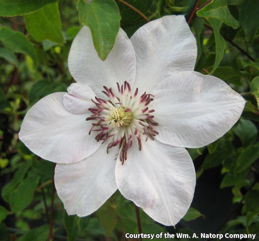 Large, pure white flowers bloom in the spring and sporatically later in the season. It is beautiful alone or may be planted with other varieties for a mixed color selection. Add to trellises, posts and fences. Pruning group 2.